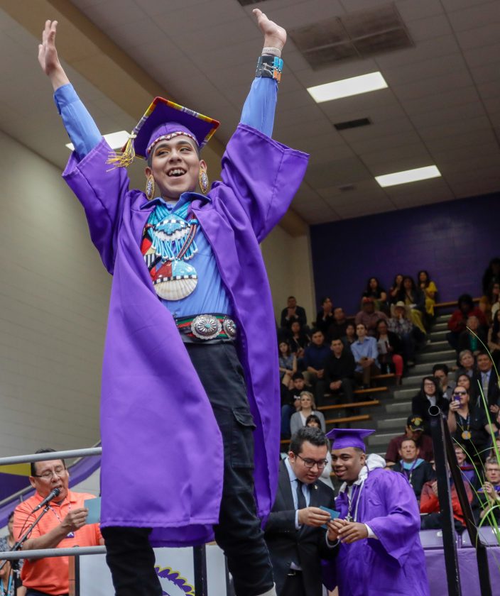 Juwan K. Tawyesva celebrates as he walks across the stage for his diploma Friday, May 10, 2019, during graduation activities at Haskell Indian Nations University.