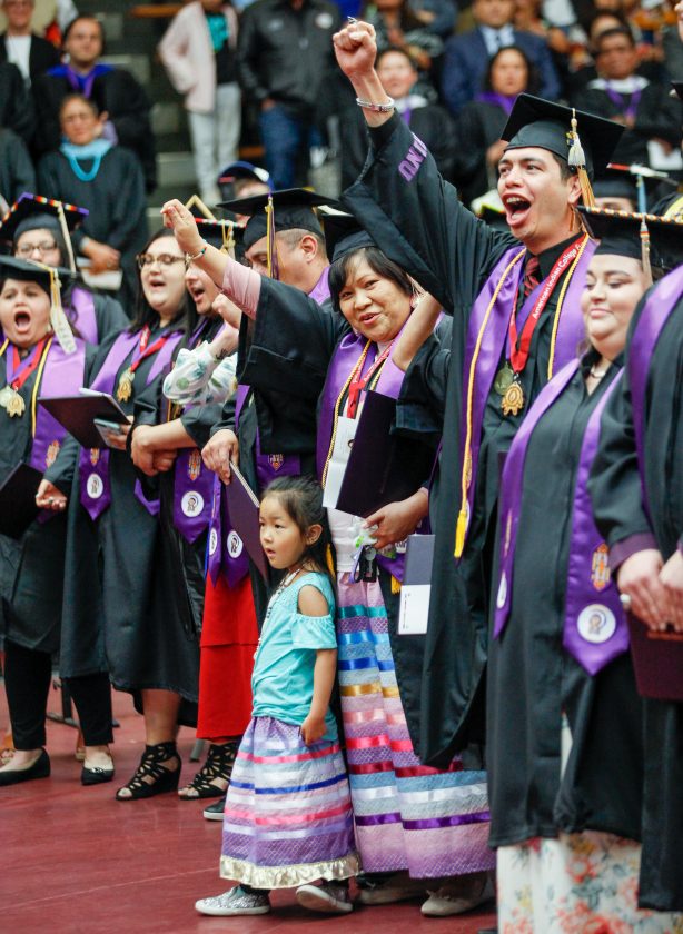 Haskell Indian Nations University graduates celebrate while singing the school song at the completion of graduation activities Friday, May 10, 2019, at HINU.