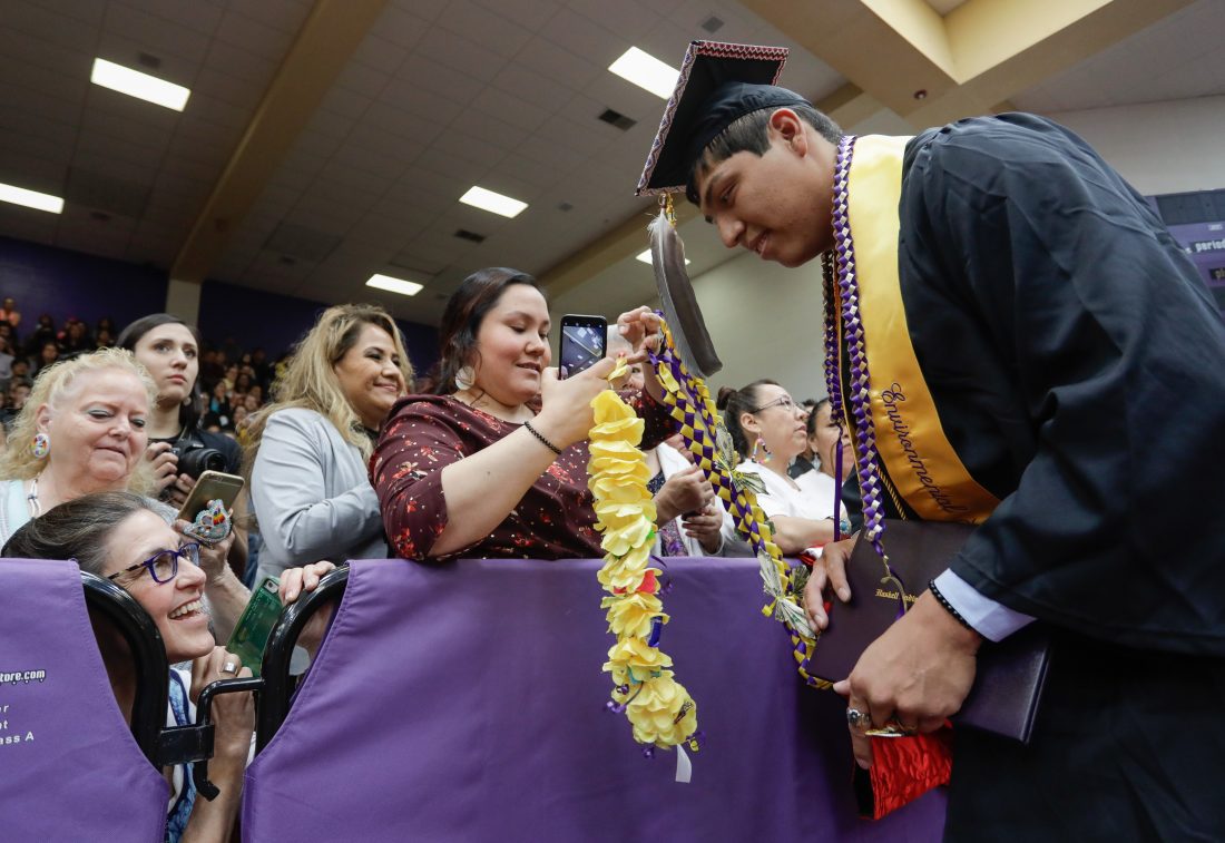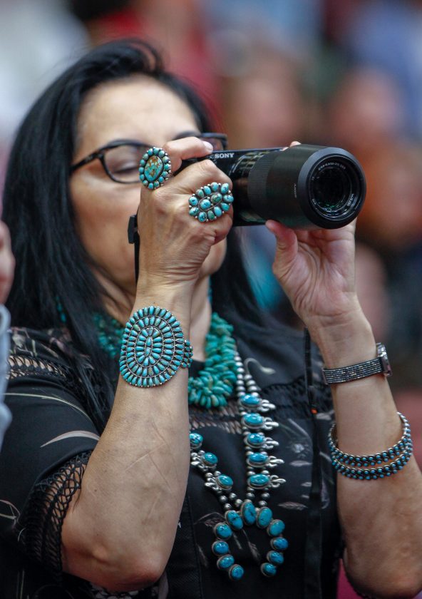 An audience member snaps photographs during Haskell Indian Nations University graduation activities Friday, May 10, 2019, at HINU.