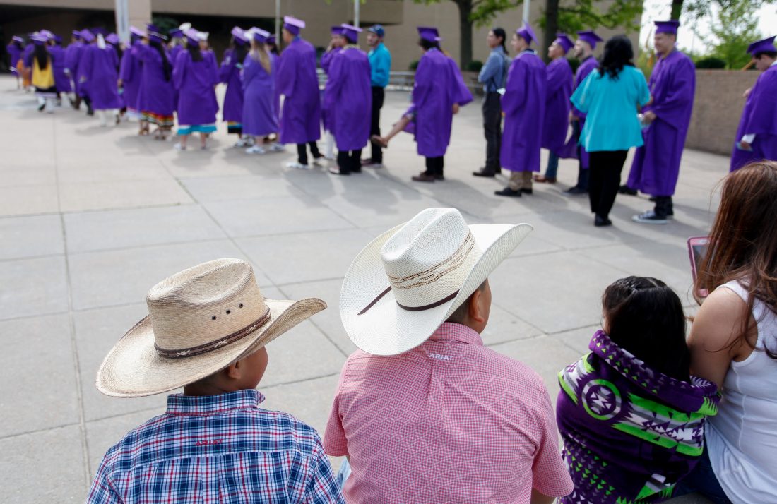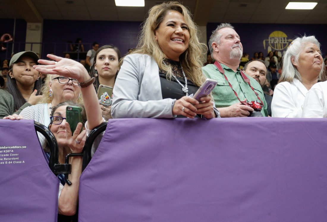 Friends and family watch as Haskell Indian Nations University graduates walk in the commencement processional during graduation activities Friday, May 10, 2019, at HINU.