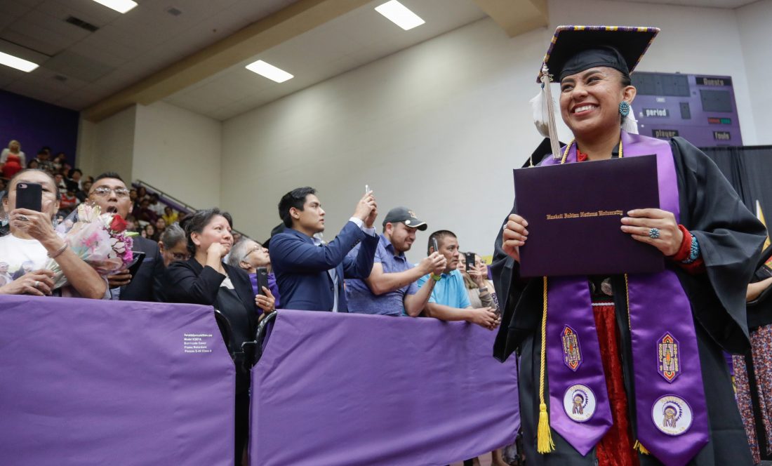 A Haskell Indian Nations University graduate holds up a diploma for a photograph during graduation activities Friday, May 10, 2019, at HINU.