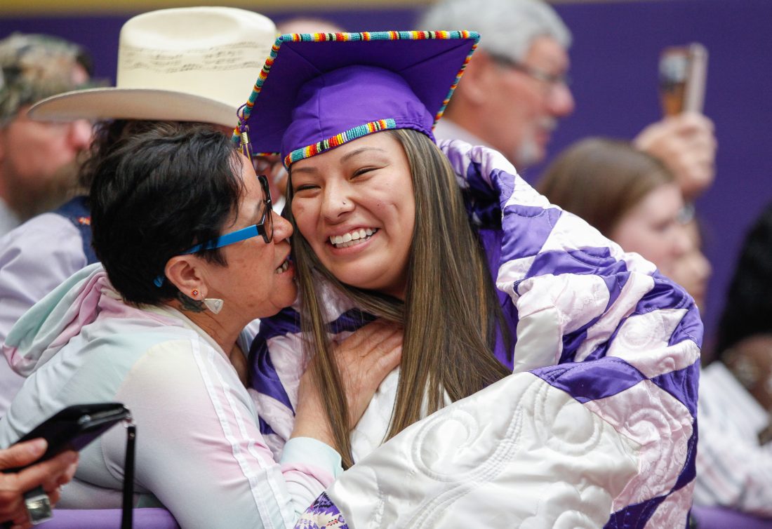Lauren J. Two Crow, right, receives a blanket and a hug from her grandmother after Two Crow received her diploma at Haskell Indian Nations University graduation ceremony Friday, May 10, 2019, at HINU.