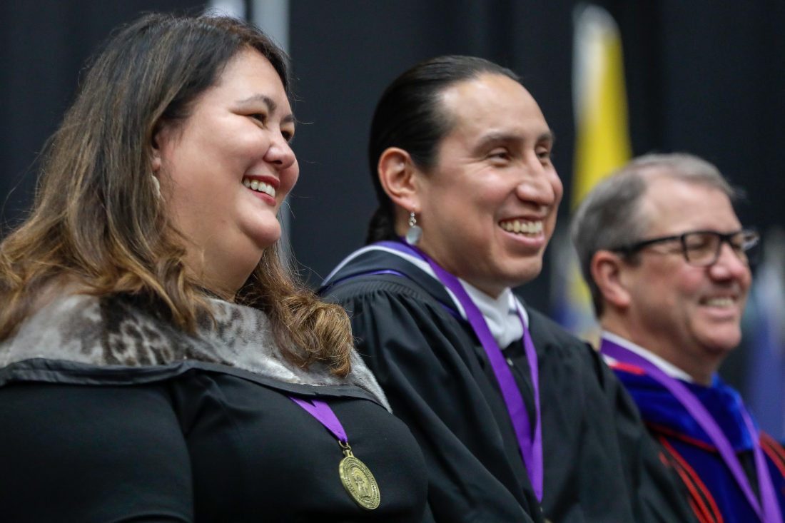 From left, Haskell Indian Nations University commencement keynote speaker and Assistant Secretary for the Bureau of Indian Affairs Tara Sweeney, Haskell Board of Regents President Brandon Yellowbird-Stevens, and University of Kansas Chancellor Douglas Girod participate in graduation activities Friday, May 10, 2019, at HINU.