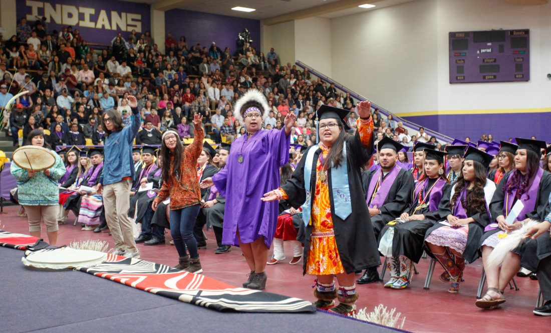 Sweeney acknowledged that Native students walk in two worlds. She urged them to remember the ancestors who blazed trails and honor them.