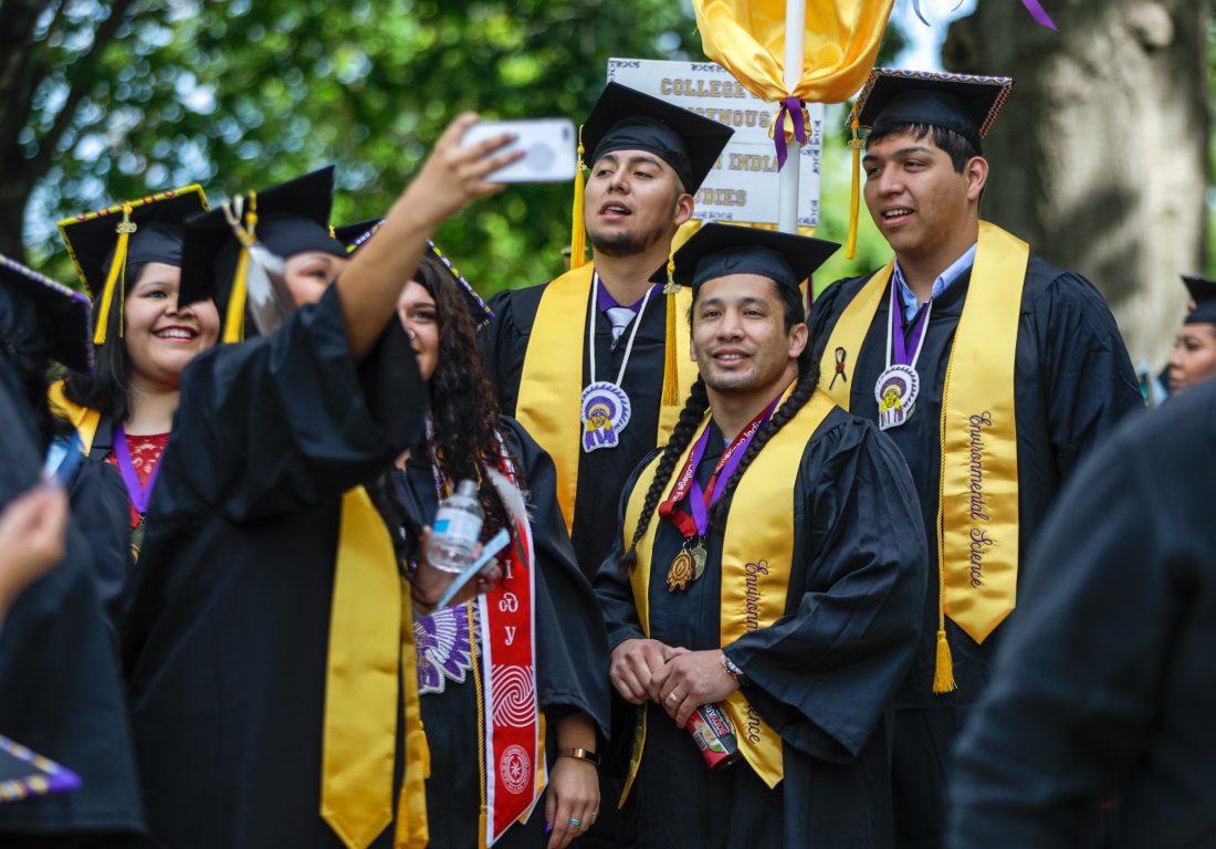 Haskell Indian Nations University graduates in Environmental Science take a group photo during graduation activities Friday, May 10, 2019, at HINU.