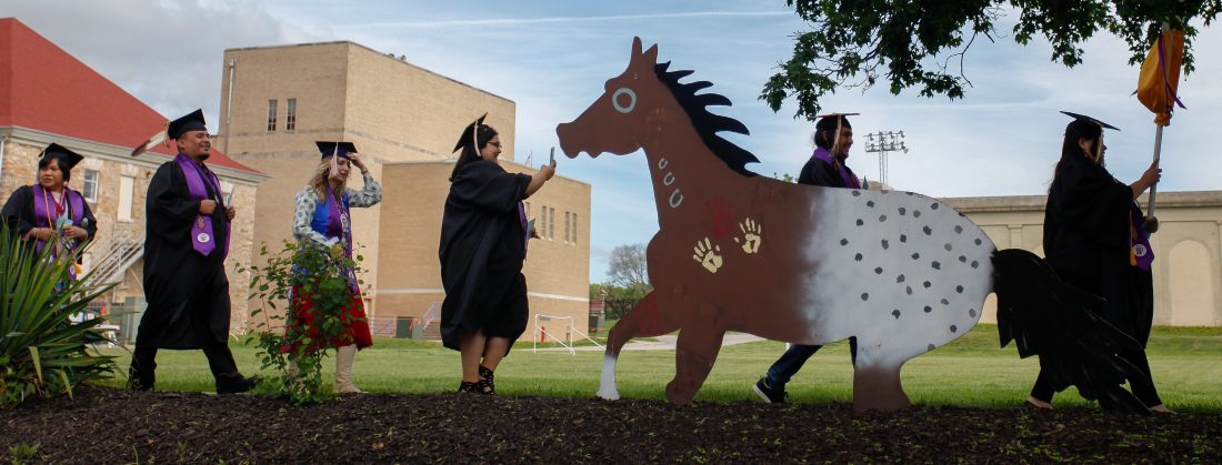 Haskell Indian Nations University graduates walk in the commencement processional during graduation activities Friday, May 10, 2019, at HINU.