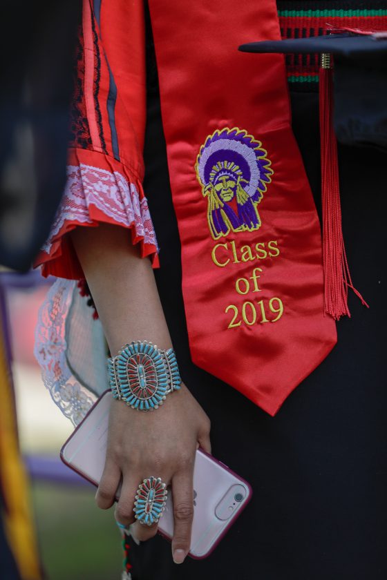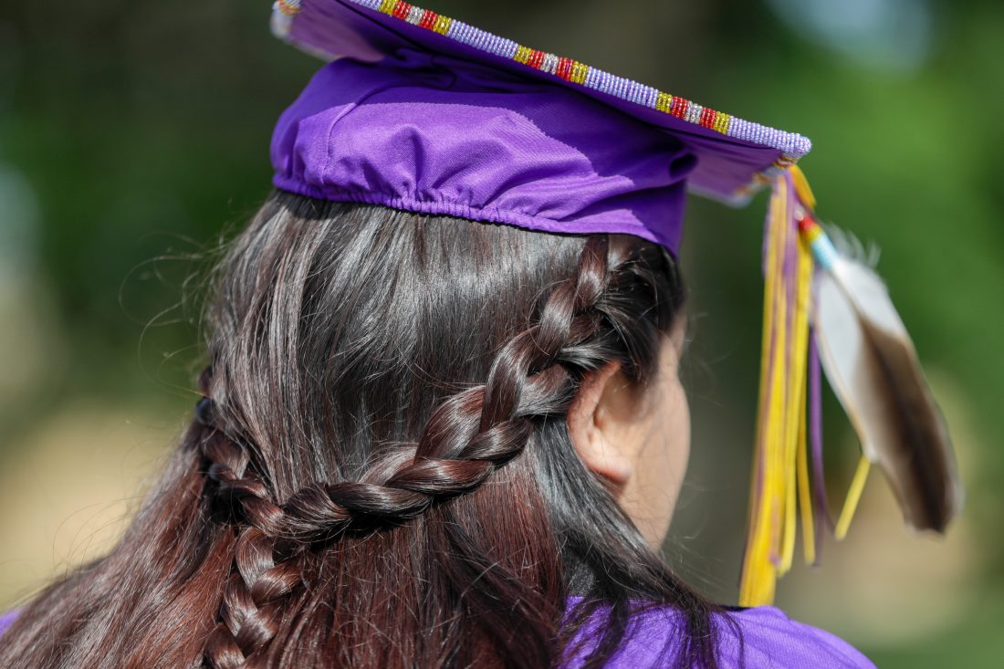 A Haskell Indian Nations University graduate participates in graduation activities Friday, May 10, 2019, at HINU.