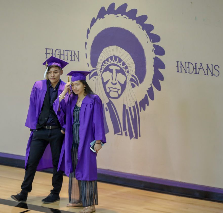 Two Haskell Indian Nations University graduates wait to line up for the processional prior to graduation activities Friday, May 10, 2019, at HINU.