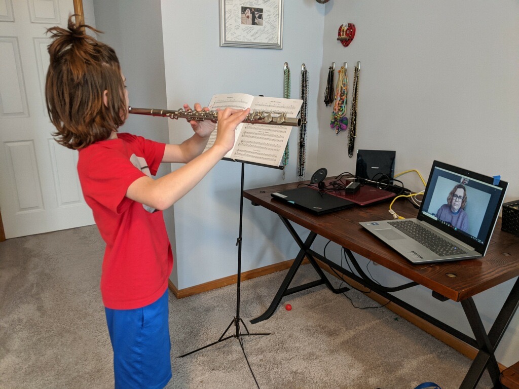 Third grader Rockwell Edwards does a flute lesson virtually with his teacher, Annie Gnojek.