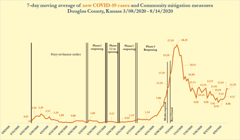 The county has averaged about 12 new cases per day over the last seven days, according to a seven-day moving average graph updated weekdays by the health department. At its height, the average was about 28 cases per day in early to mid-July. The current average of 12 cases per day is up from a recent low of about seven cases per day in early August.