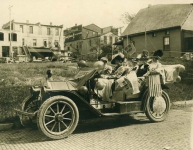 A photograph showing suffragists seated in an automobile and holding signs "Vote for women," in Lawrence, Douglas County. The women were participating in an automobile parade at the Douglas County Fair. The women are identified: Mrs. Paul R. Brooks, first president of Douglas County League; Mrs. Frank Strong, wife of the Kansas University chancellor and first vice president of the Douglas County League; Miss Florence Payne, former president of College League; Marcella Chalkley; Mr. Clement Perkins; and Miss Dorothy Williston. This photo was thought to be taken between 1910 and 1912.
