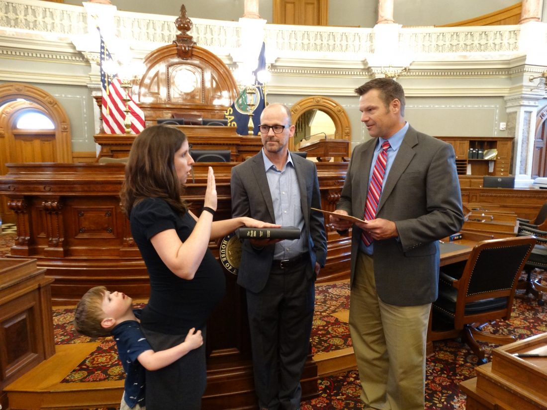 Eileen Horn, a Lawrence Democrat, takes the oath of office for the 10th District seat in the Kansas House in 2017. Standing with Horn and former Secretary of State Kris Kobach, right, were her husband, Rick Martin, and their then 2-year-old son, Leo.