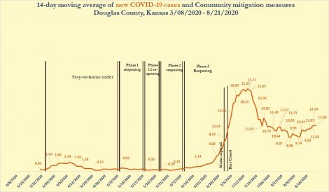 The county has averaged about 12 new cases per day over the last 14 days, according to a 14-day moving average graph updated weekdays by the health department. At its height, the 14-day average was about 22 cases per day in early to mid-July. The current average of 12 cases per day is up from a recent low of about nine cases per day in early August.