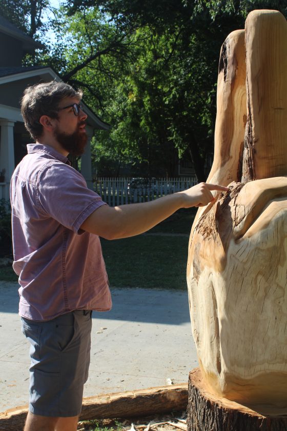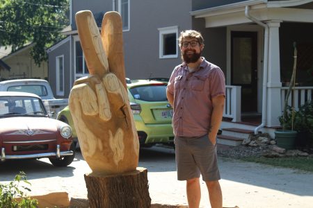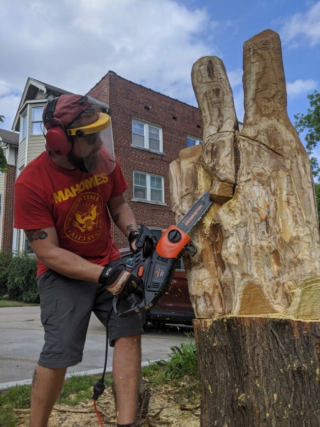 In his second-ever wood carving project, Danny Mantyla made a peace sign out of a mulberry tree in his front yard between 15th and 16th Streets on Massachusetts Street.