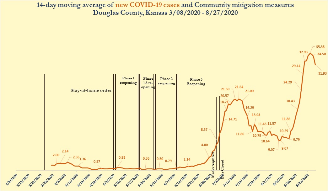 The county has averaged about 32 new cases per day over the last 14 days, according to a 14-day moving average graph updated weekdays by the health department. Previously, the highest 14-day average was about 35 cases per day in mid-August. The current average of 32 new cases per day is up significantly from a recent low of about nine cases per day in early August.