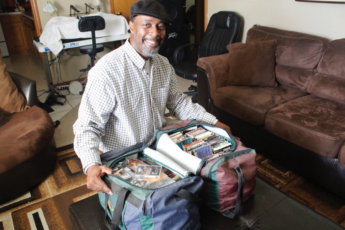 Michael Freeland Jr., pictured in his Lawrence home on Oct. 30, has two duffel bags full of old cassette tapes from when he was younger.