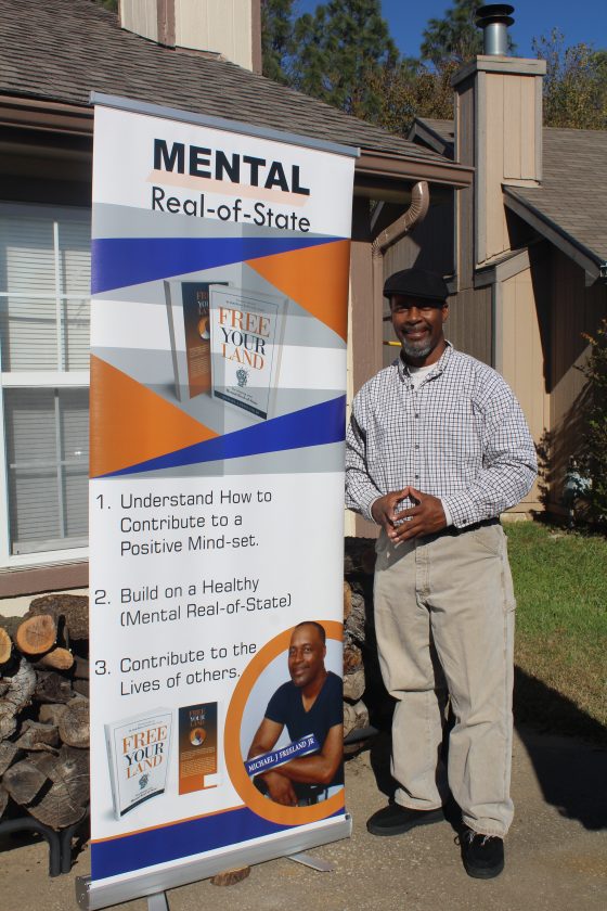Michael Freeland Jr. is pictured outside his Lawrence home with a promotional poster for his book, “Free Your Land: Developing Your Mental Real-Of-State.”
