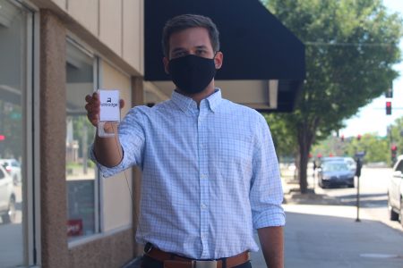 Local engineer James Crowder holds up his invention, the AllBadge, an ID badge holder that also functions as a contactless way to open doors.