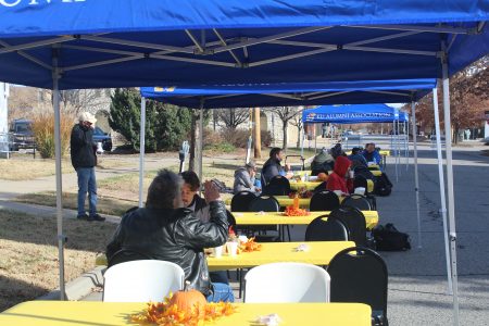 The meals Pellegrini, her partner, Matt Chambers, and his son, Alex Chambers, had before them included turkey, dressing, mashed potatoes and other holiday trimmings. It was a traditional LINK community Thanksgiving meal served in a nontraditional manner. Those choosing not to take their meals home from the distribution site ate at tables under open-air tents on the 200 block of West 10th Street rather than at the usual meal site, the basement of First Christian Church.