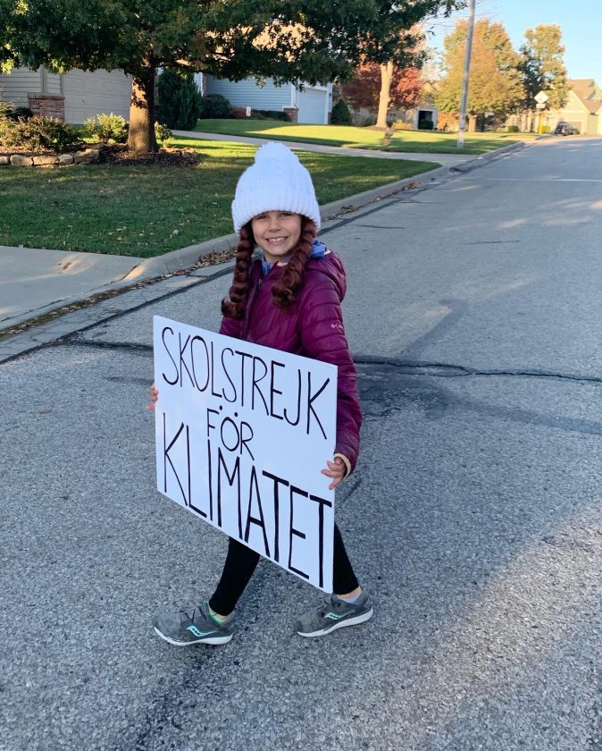 For over a year, 10-year-old Dylan Tenbrink has been standing outside Raintree Montessori School on Friday mornings, protesting about climate change with her sign, “Our planet, our future.”