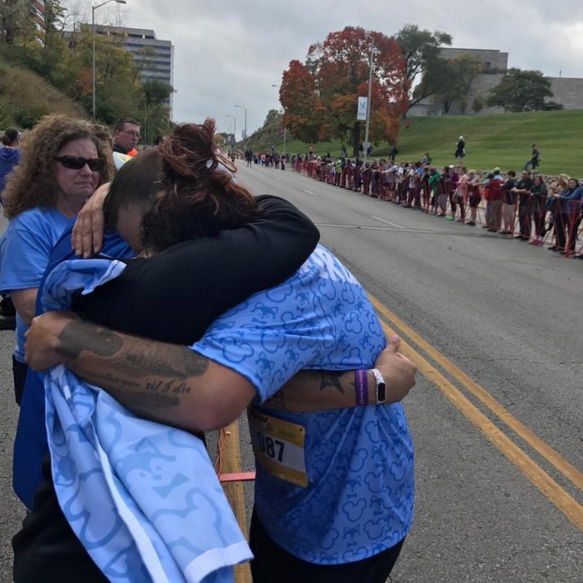 Ryan Ortiz stopped before the finish line at the Kansas City Marathon in October of 2017 to hug his brother, Rob Ortiz, and sister-in-law Kaylen Ortiz.