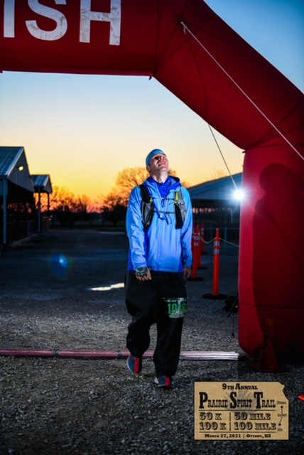 Ryan Ortiz is pictured crossing the finish line after running 100 miles at the Prairie Spirit Trail race in March of 2021.
