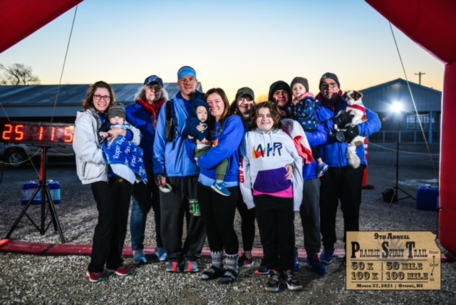 Ryan Ortiz and his family are pictured after he finished his 100-mile race on the Prairie Spirit Trail in March of 2021.