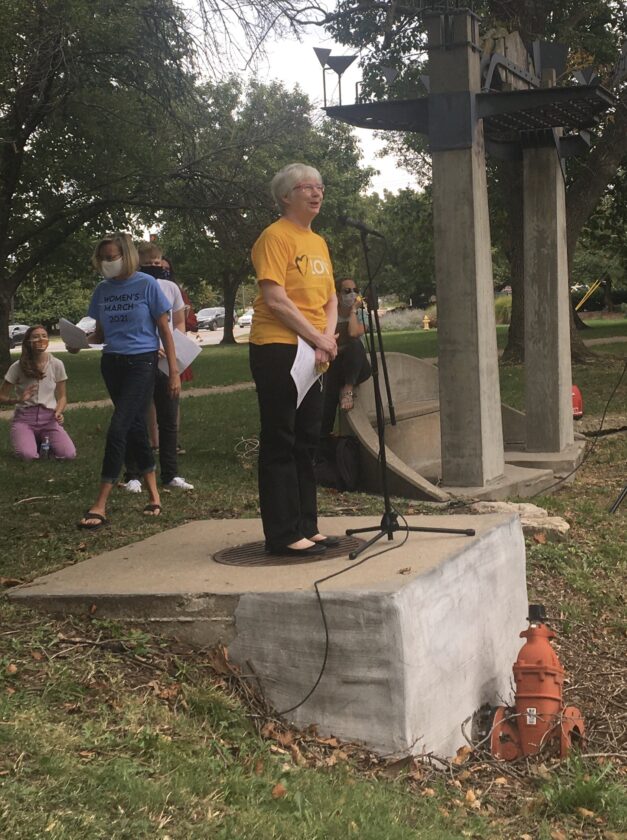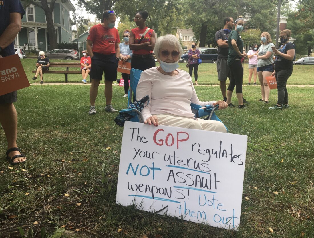 Sandy Robertson, of Olathe, attends the reproductive rights rally in Watson Park on Saturday, Oct. 2, 2021.