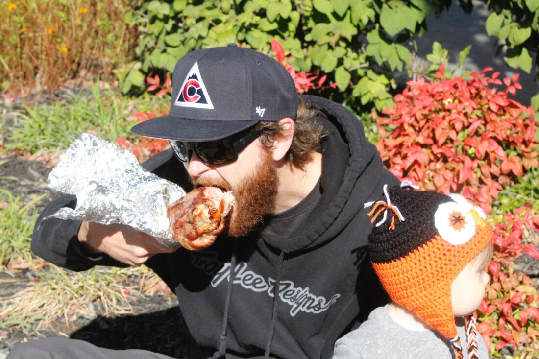 Curren Rose, of Colorado Springs, Colo., sits with his 1-year-old son Rowan and enjoys a turkey leg Saturday, Oct. 1, 2021, at the Maple Leaf Festival in Baldwin City.