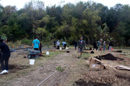 It will be a few years before the trees start to help feed people, though. Matt Bunch, a horticulturist with the Giving Grove, said the 3-year-old trees planted Saturday wouldn’t produce fruit for another three years, and that they wouldn’t reach their full levels of production until two to three years after that. He said all of the trees and bushes were hardy, drought-resistant varieties that should thrive in the local climate.