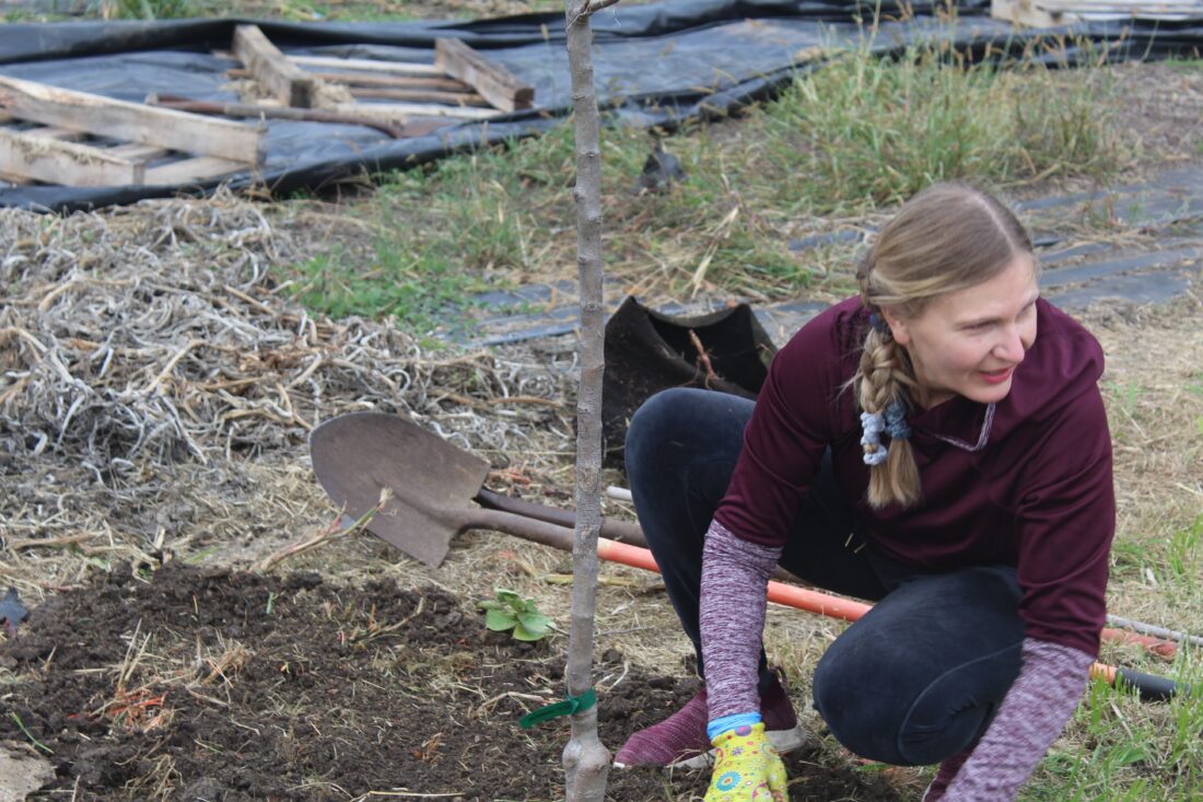 Yuliya Platkowski spreads mulch around the base of a newly planted fruit tree on Saturday, Oct. 23, 2021, in the Little Prairie Donation Garden in Peterson Park.