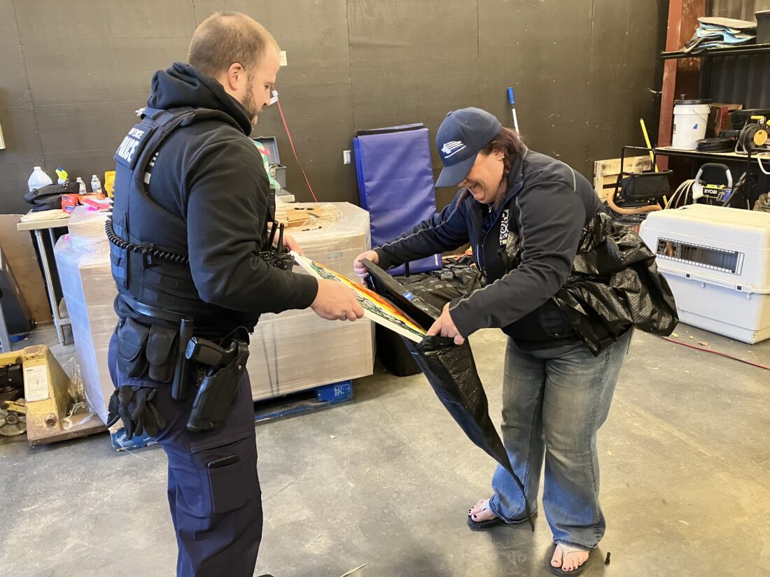 Lawrence Police Officer Josh Doncouse helps put a canvas in a plastic bag with Emily Fawcett, of Friends of the K9 Vest Midwest, in preparation for patrol service dog Shadow to create a painting, Sunday, Dec. 11, 2022, at Lawrence Police Headquarters.