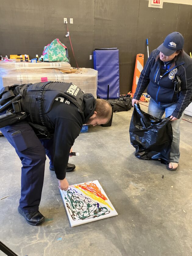 Fawcett said the dog paintings have been a successful way to raise funds for the vests, and they’ve also allowed officers to have some fun as well, as evidenced by Shadow’s handler Josh Doncouse, whose creative instincts led him beyond random paint splattering Sunday to something vaguely resembling a sunset in a forest.