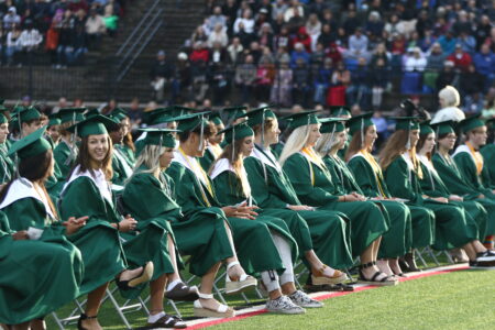 Families of Free State High School graduates watch the commencement ceremonies on Thursday, May 26, 2022, at Free State High School’s stadium.