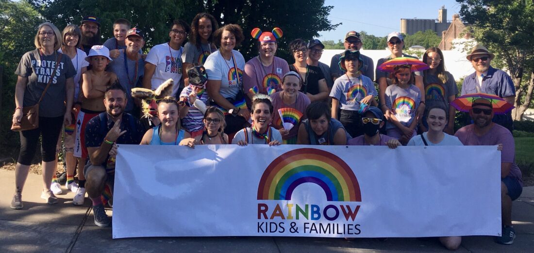 Members of the Rainbow Kids and Families organization are pictured at a Pride event.