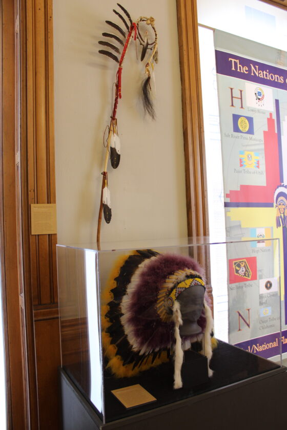 A couple items on display, such as the Choctaw Nation war staff hanging on the wall, are on loan to Watkins for the exhibit courtesy of guest curator Geoff Pate’s family. Pate graduated from Haskell Indian Nations University last year, and his family has deep roots at the university.