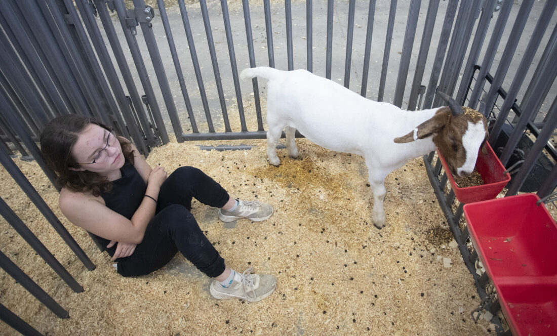 Allee Leming, 12, a member of the Kanwaka 4-H Club, sits with her Boer goat Phoenix at the Douglas County Fair Wednesday, July 26, 2023, at the Douglas County Fairgrounds.