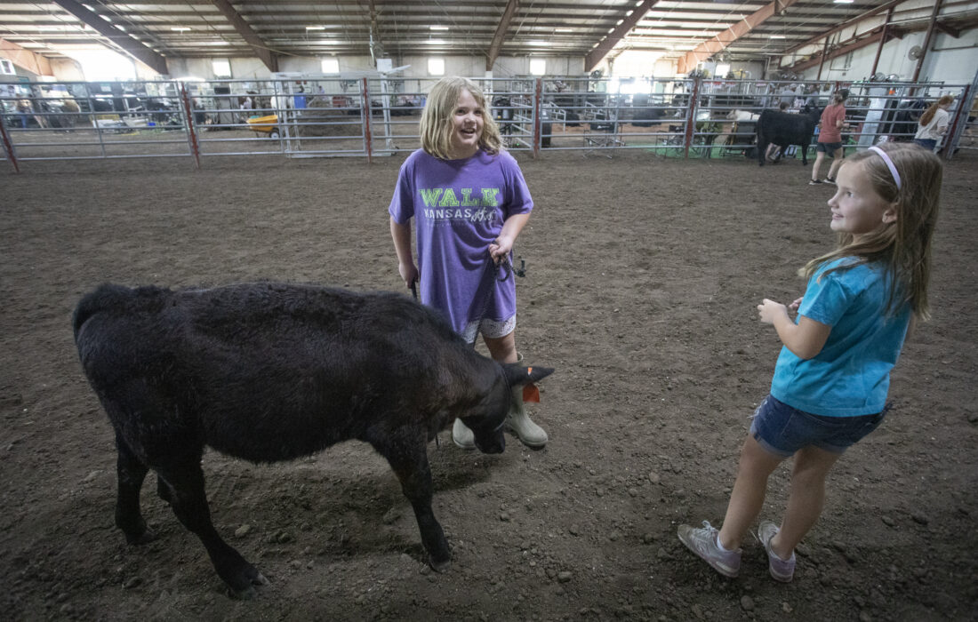 Sadie Harding, 9, a Palmyra 4-H Club member, helps Morgan Neis, 7, work with Neis’ calf, Peanut, for the bucket calf competition at the Douglas County Fair Wednesday, July 26, 2023, at the Douglas County Fairgrounds.