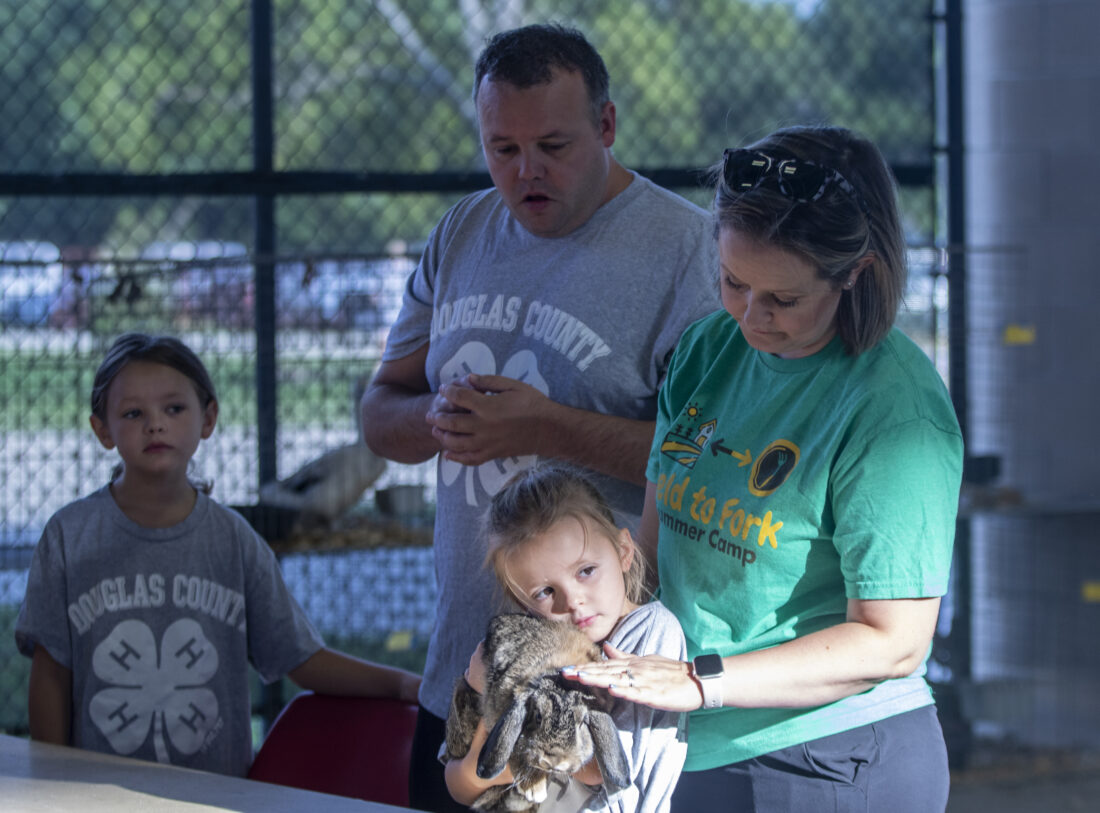 Ellis Peine, 5, holds one of her family’s rabbits, Angel, at the Douglas County Fair Wednesday, July 26, 2023, at the Douglas County Fairgrounds. From left are Emery Peine, 7, a Eudora 4-H Club member, and parents John and Kaitlyn Peine. Emery will compete in the showmanship category with Angel.