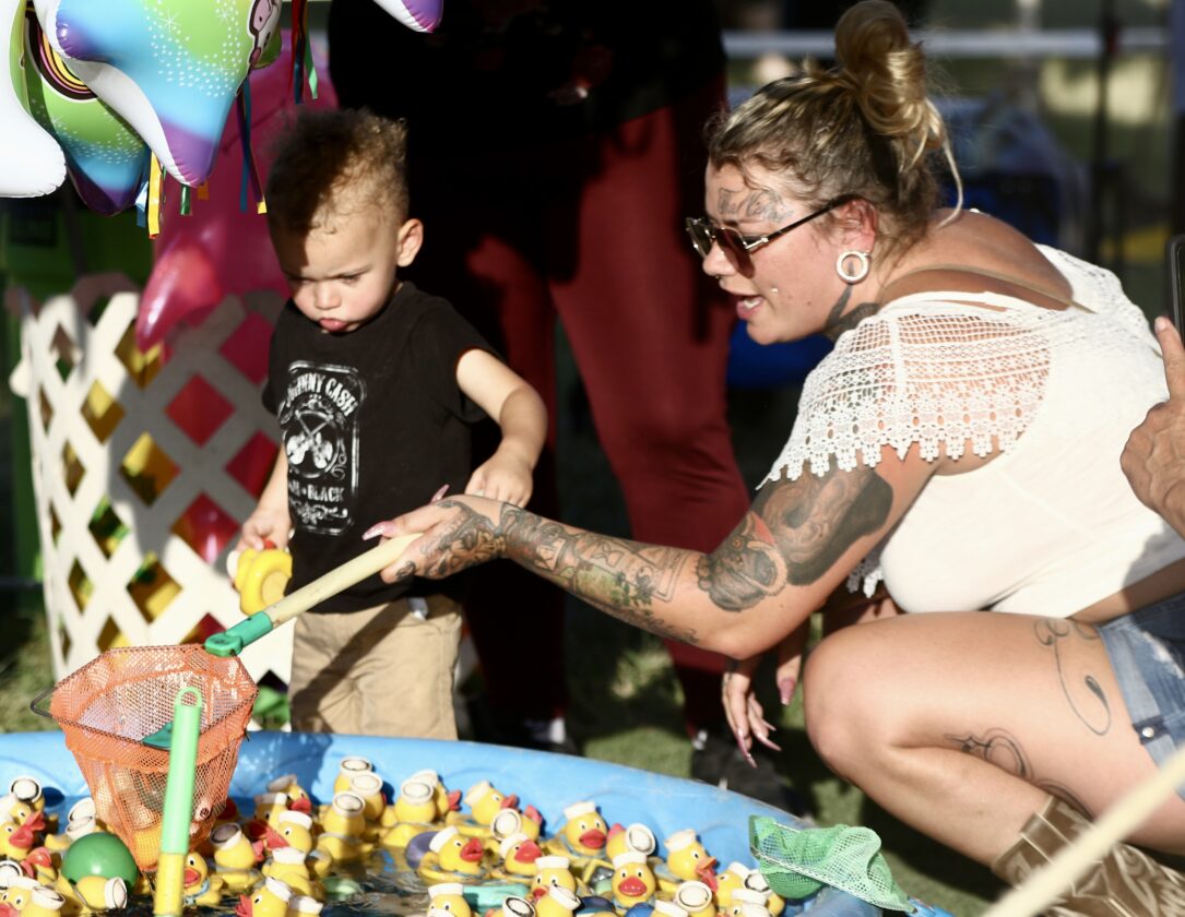 Kaenin Montgomery, 2, pulls a duck from a pool with help from his mom, Kay Ledbetter, at the Douglas County Fair on Saturday, July 29, 2023.