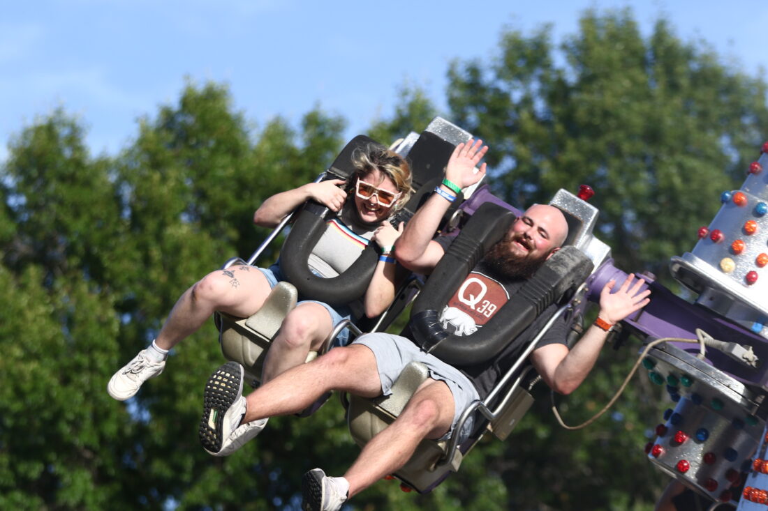 Crosby Woods and Jake Kanning, both of Lawrence, ride a carnival ride on Saturday, July 29, 2023, at the Douglas County Fair.