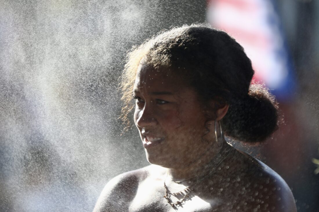 Taeghan Sharpe, 23, Lawrence, stands beneath a mister of cool water at the Douglas County Fair on Saturday, July 29, 2023.