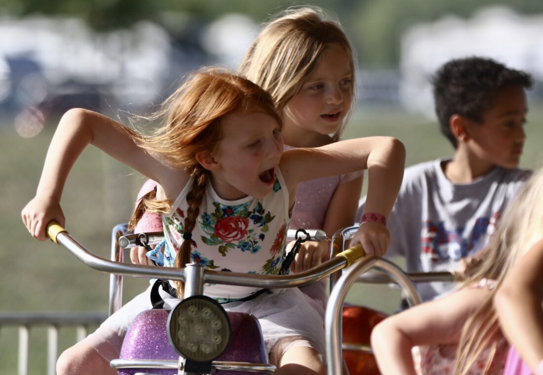 Ruth Stewart, 6, leans into a fast curve on a ride with Kennadi Gordon, 6, at the Douglas County Fair on Saturday, July 29, 2023.