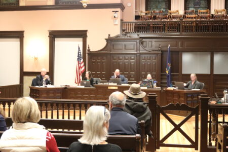 Skyler Adamson, Lawrence Fruit Tree Project coordinator with Sunrise Project, center, prepares to plant a Serviceberry tree at the Lawrence Public Library Saturday, April 6, 2024. Around the tree, members of the Fruit Tree Community Choir sang a planting song for each of eight fruit trees planted around the library. The Fruit Tree Community Choir was a recipient of a 2023 Rocket Grant through a partnership of Charlotte Street and the Spencer Museum of Art with funding from the Andy Warhol Foundation for the Visual Arts.