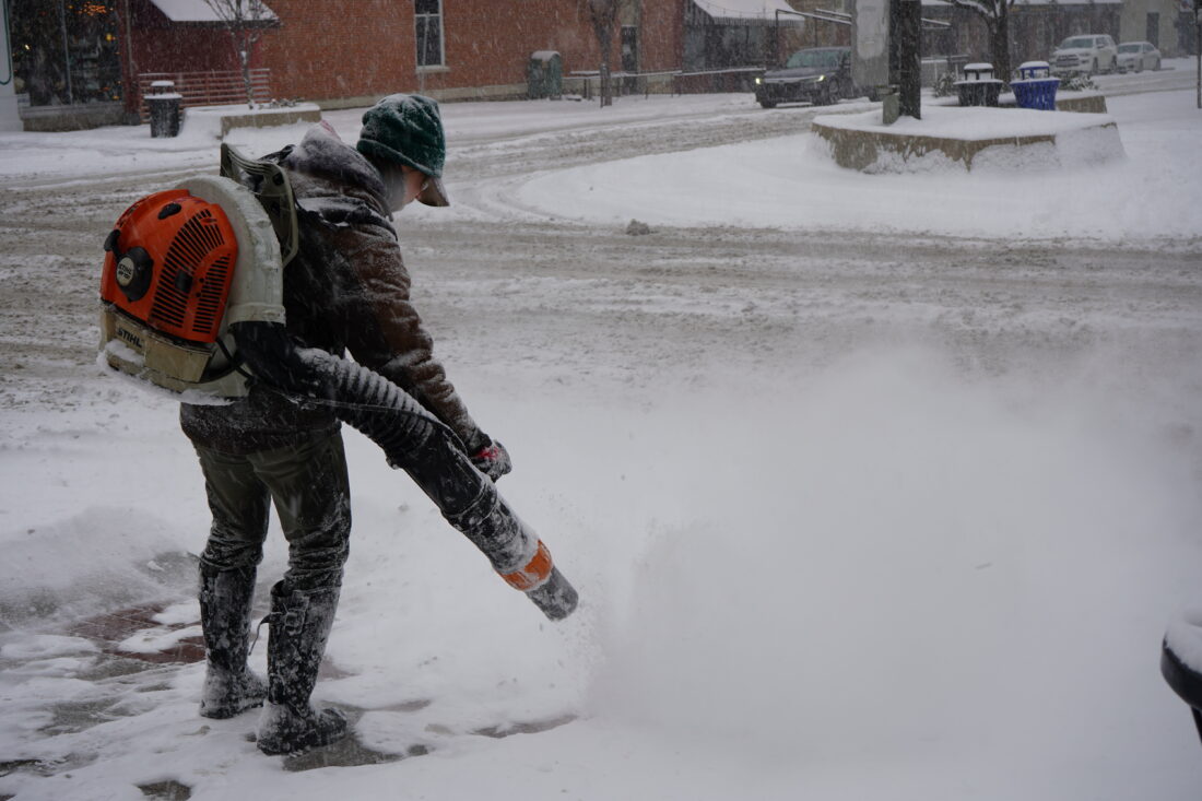 A worker clears the sidewalk in front of La Prima Tazza on Monday, Dec. 1, 2025.