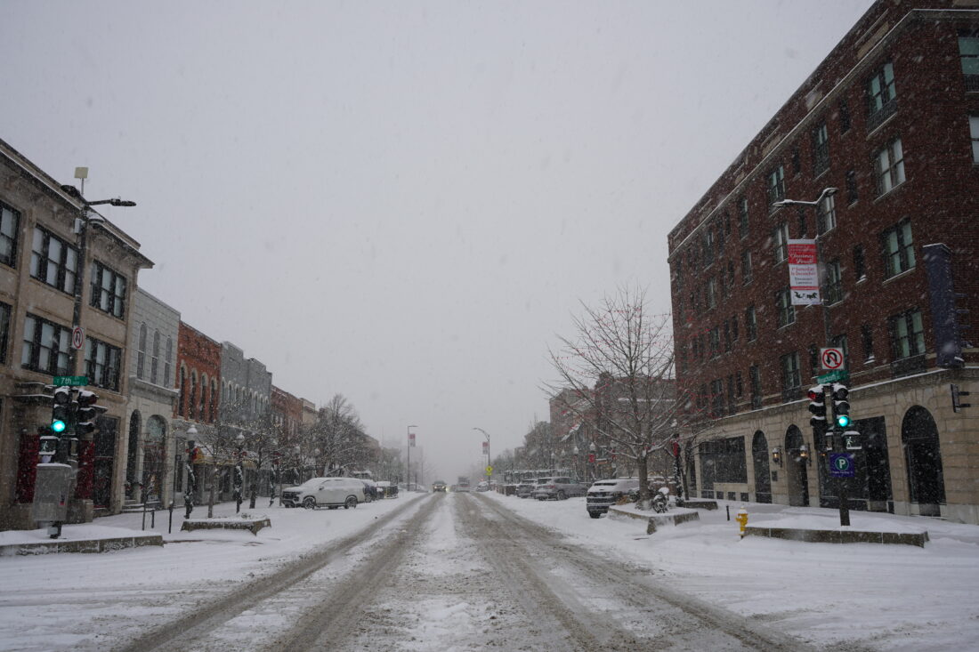 Downtown Lawrence during the first winter storm of the season on Monday, Dec. 1, 2025.