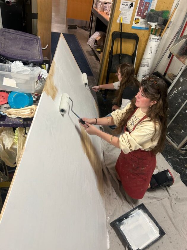 Hang12 staff paint the wood for their art panels that will eventually be displayed in the parking garage across from the Lawrence Arts Center.