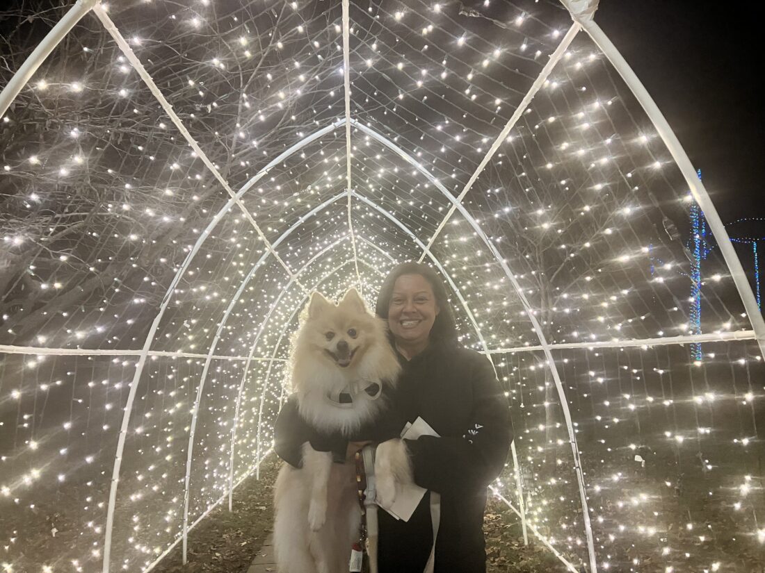 Melissa Corbin and her dog, Bentley, pose for a photo Tuesday evening, Dec. 17, 2024, in the light tunnel at South Park.