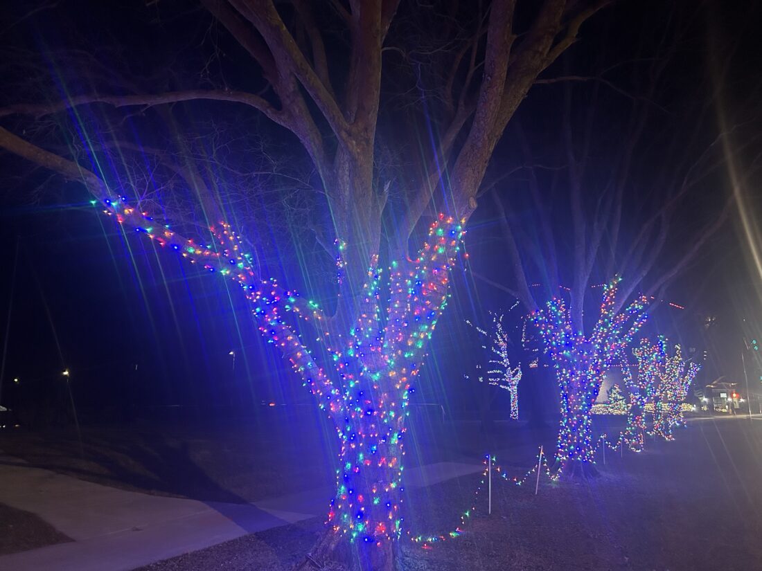 Lights strung along trees in Robinson Park near downtown Lawrence. The city’s forestry department plays a big role in hanging up the holiday lights in Lawrence, with crews spending around 1,500 man-hours working to prepare the holiday lights.