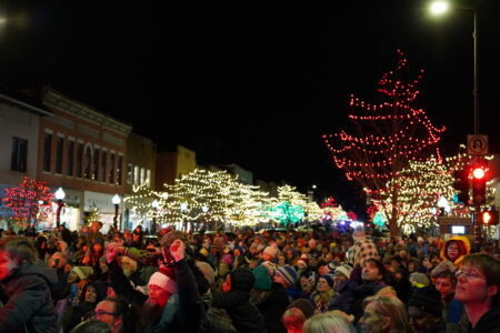 A crowd cheers as the lights are lit in downtown Lawrence on Massachusetts Street on Friday, November 28, 2025.